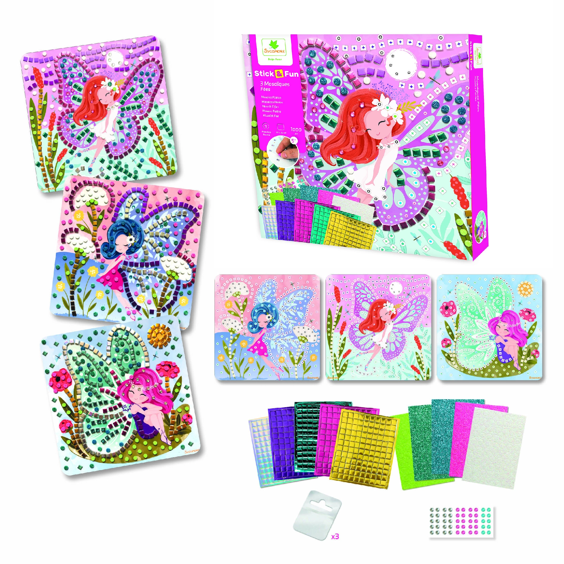 Děti budou nadšené, když si budou moci vytvořit vlastní nádherné mozaikové obrazy s vílami. Pomocí samolepicích kamínků a třpytivých mozaikových dílků dokončí každý obrázek, který pak může zářit svým vlastním jedinečným leskem. Po dokončení si děti mohou obrazy hrdě vystavit pomocí přiložených průhledných závěsů.