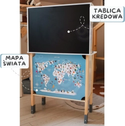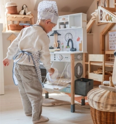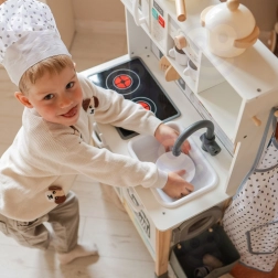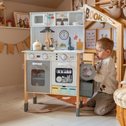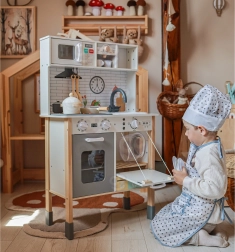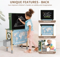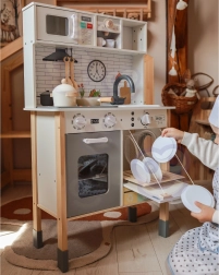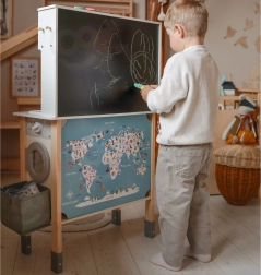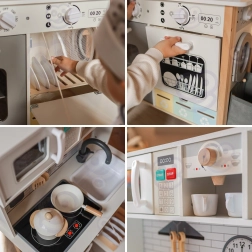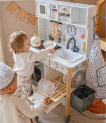 Tato dřevěná kuchyňka WOOPIE GREEN je navržena pro malé kuchaře a objevitele. Přední část nabízí bohatě vybavenou kulinářskou zónu s kávovarem, mikrovlnkou, dřezem, troubou, myčkou a indukční varnou deskou se světly a zvuky. Z boku je praktická pračka s košem na prádlo, která hravou formou učí dětské rutiny. Zadní strana ukrývá křídovou tabuli a barevnou mapu světa pro kreslení, poznávání kontinentů a rozvíjení fantazie.