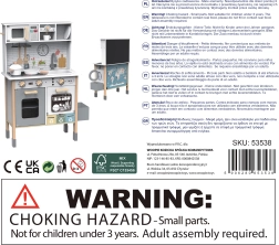Součástí je bohaté příslušenství: nádobí, kuchařská výbava, tabulka na třídění odpadu do výsuvných košů i kuchařský set (zástěra a čepice). Výšku kuchyňky lze nastavit pro pohodlné používání. Baterie nejsou součástí balení.
