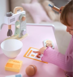 Objevte kouzlo pečení s dřevěným mixérem v jemných pastelových barvách, který dětem umožní napodobovat svět dospělých. Od otáčení knoflíkem po míchání v míse – realistické detaily a bezpečné zaoblené prvky z kvalitního dřeva z něj dělají ideální doplněk do každé dětské kuchyňky.