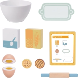 Součástí je kompletní sada doplňků: míska, mouka, cukr, vejce na suchý zip, váleček, plech na pečení, sušenky i recept. Hra rozvíjí kreativitu, představivost, manuální dovednosti a koncentraci – a přitom je to zábava bez obrazovky.