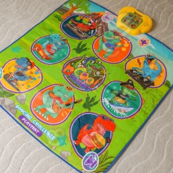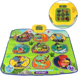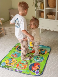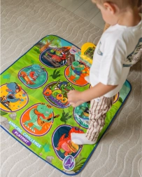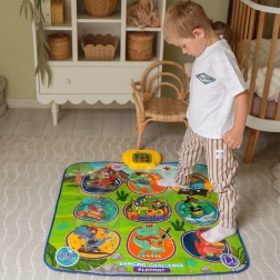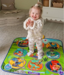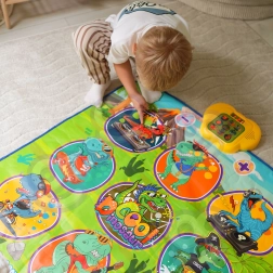 Veselá taneční podložka s dinosaury motivuje děti k pohybu a interaktivnímu učení. Devět velkých, barevných polí reaguje na dotyk a vedení kroků zajišťuje ovládací modul, který zábavnou formou podporuje koordinační schopnosti, pocit rytmu a sluchové vnímání. Měkká konstrukce je příjemná na došlap a bezpečná pro každodenní hraní.