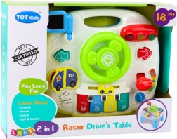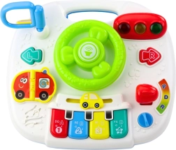 Panel obsahuje mnoho pohyblivých a interaktivních prvků: volant s klaksonem, světelnou signalizaci, klávesy piana do-re-mi-fa, otočný knoflík pro regulaci zvuku, knížku s obrázky vozidel, zrcátko, pohyblivou řadicí páku, autíčko a další barevná tlačítka. Stisknutím tlačítek dítě uslyší zvuky auta, písničky, veselé melodie a také spustí světelné efekty.