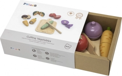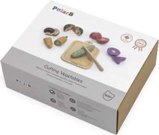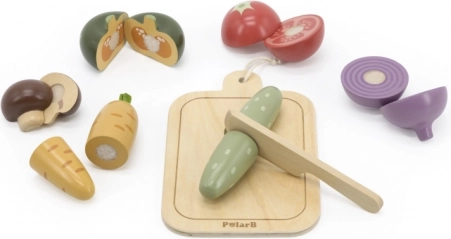 Dřevěná sada na krájení zeleniny pro děti. Obsahuje prkénko, nůž a šest druhů zeleniny. Věk 18 měsíců+.