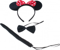 Tato kompletní kostýmní sada myšky je ideální pro karneval, Halloween, školní besídky i domácí hraní. K ikonickým uším s červenou puntíkovanou mašlí ladí černý motýlek a ocásek, takže převlek je hotový během pár vteřin.