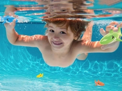- Potápění po žraloky: Žraloky rozhoďte po bazénu nebo brouzdališti. Jakmile se potopí na dno, dítě má za úkol je vylovit, čímž se naučí se zanořit a kontrolovat dech.
