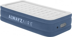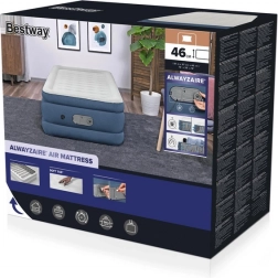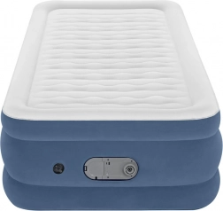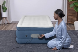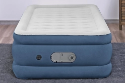 Vyšší konstrukce (46 cm) usnadňuje vstávání a ukládání, zatímco boční rám zajišťuje ochranu proti sklouznutí během spánku. Integrovaný port USB a elektrická pumpička (220-240V) poskytují moderní řešení pro každodenní použití. Vyrobeno z odolného materiálu PVC pro delší životnost.