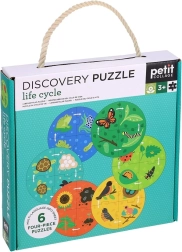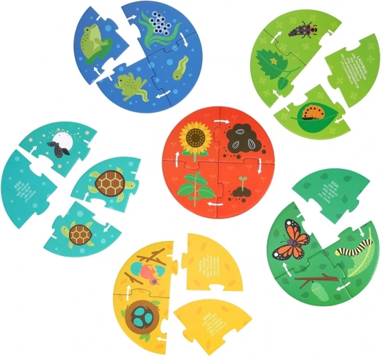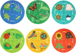 Puzzle Objevitele Koloběh Života pomáhá probouzet zájem o svět přírody. Tato sada obsahuje šest malých puzzle, které ilustrují životní fáze berušky, motýla, želvy, žáby, květiny a ptáka. Produkt přispívá k rozvoji koordinace ruka-oko, kognitivního vývoje a schopnosti řešit problémy.