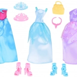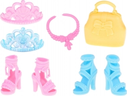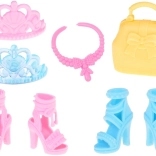 Dvě elegantní páry bot na podpatku přidávají celkovému vzhledu na šarmu a stylu. Doplňky, jako je efektivní kabelka, růžový náhrdelník a dvě korunky jsou perfektní pro každou malou princeznu.