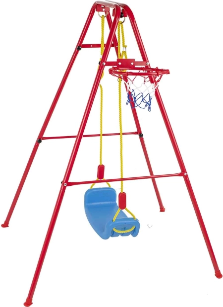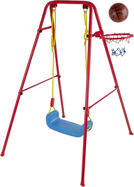 Tato univerzální zahradní houpačka kombinuje oblíbené houpání s basketbalovou zábavou. Stabilní kovový rám s průměrem trubek cca 2,5 cm a pevné lano drží široké plastové sedátko (cca 43 × 25,5 cm) pro pohodlné a bezpečné používání. Součástí je basketbalový koš, který lze snadno připevnit na rám, a také mini míč a pumpička pro okamžité hraní.