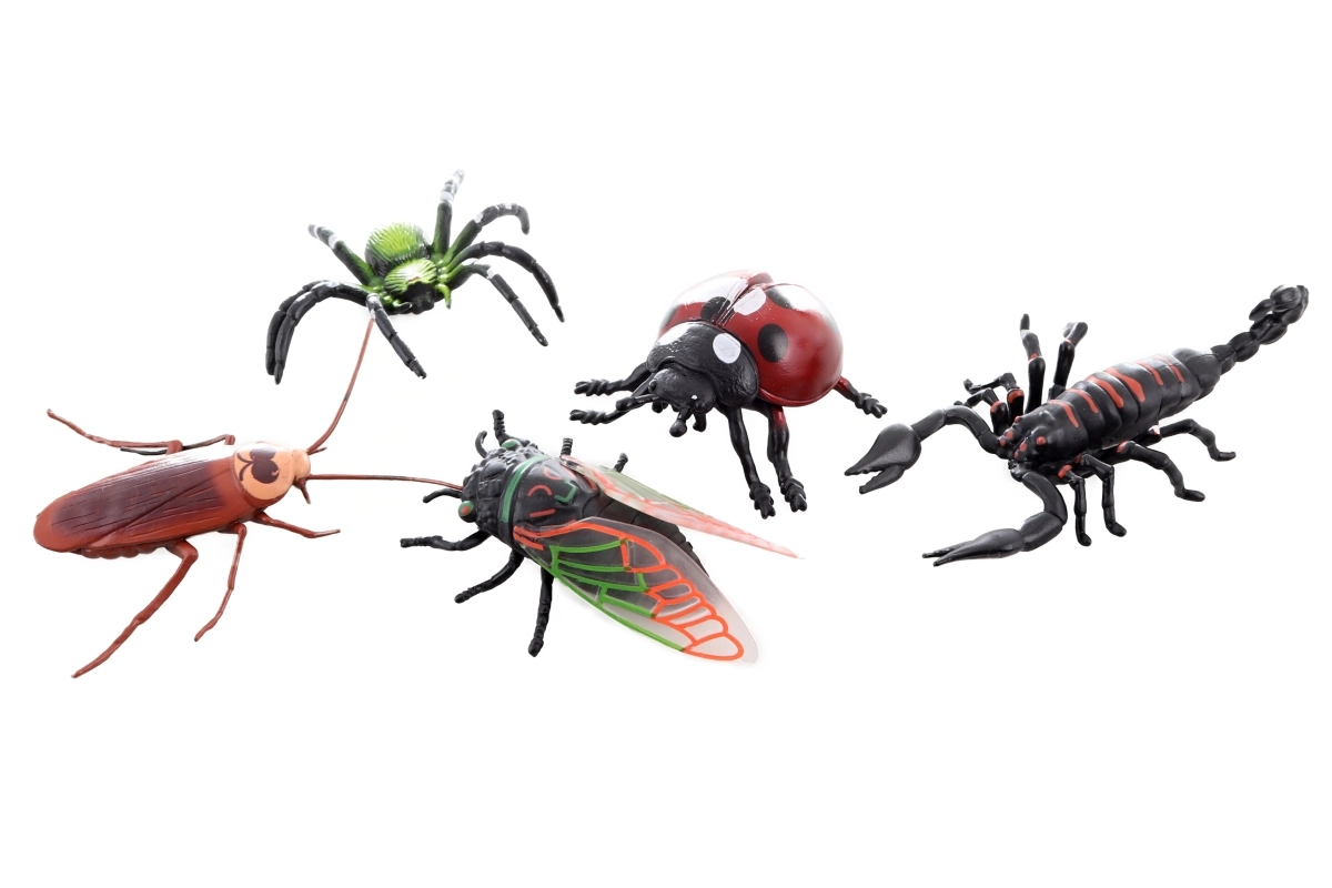 Užijte si zábavu s sadou plastových zvířátek, která zahrnuje berušku, pavouka, mouchu, brouka a štíra, ideální pro malé objevitele.