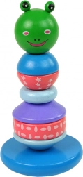 Tato barevná dětská pyramida obsahuje 6 zakulacených kroužků v různých velikostech a vzorech s roztomilou hlavičkou žabky na vrcholu. Základna ve tvaru polokoule způsobuje, že při každém dotyku balancuje, což ztěžuje umístění kroužků na kolík, a tím rozvíjí dětskou představivost a koordinaci oko-ruka.