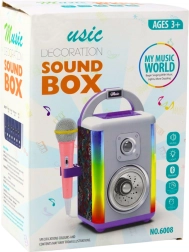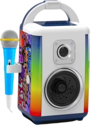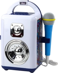 Hudební sada je vybavena mikrofonem, snadno přenosným designem a vstupy pro sluchátka a MP3. Na panelu můžete měnit režimy, efekty a hlasitost. Režim Bluetooth umožňuje přehrávání oblíbených skladeb z telefonu nebo MP3 přehrávače. Díky kompaktním rozměrům a intenzivním zvukovým a vizuálním efektům je sada perfektní pro domácí použití i dětské oslavy.