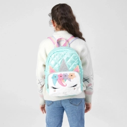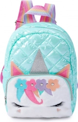 Model je vyroben z odolného a přitom lehkého materiálu, který je odolný vůči dennímu používání. Na přední straně se nachází měkká aplikace s motivem jednorožce, včetně vystouplých uší a rohu, což přidává na jeho unikátnosti. Batoh obsahuje hlavní prostornou komoru, jednu menší vnitřní kapsu a další vnější kapsu na zip.