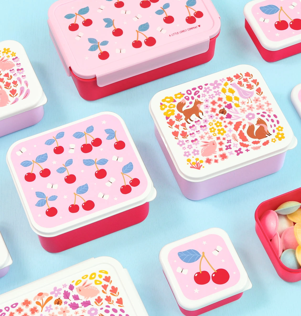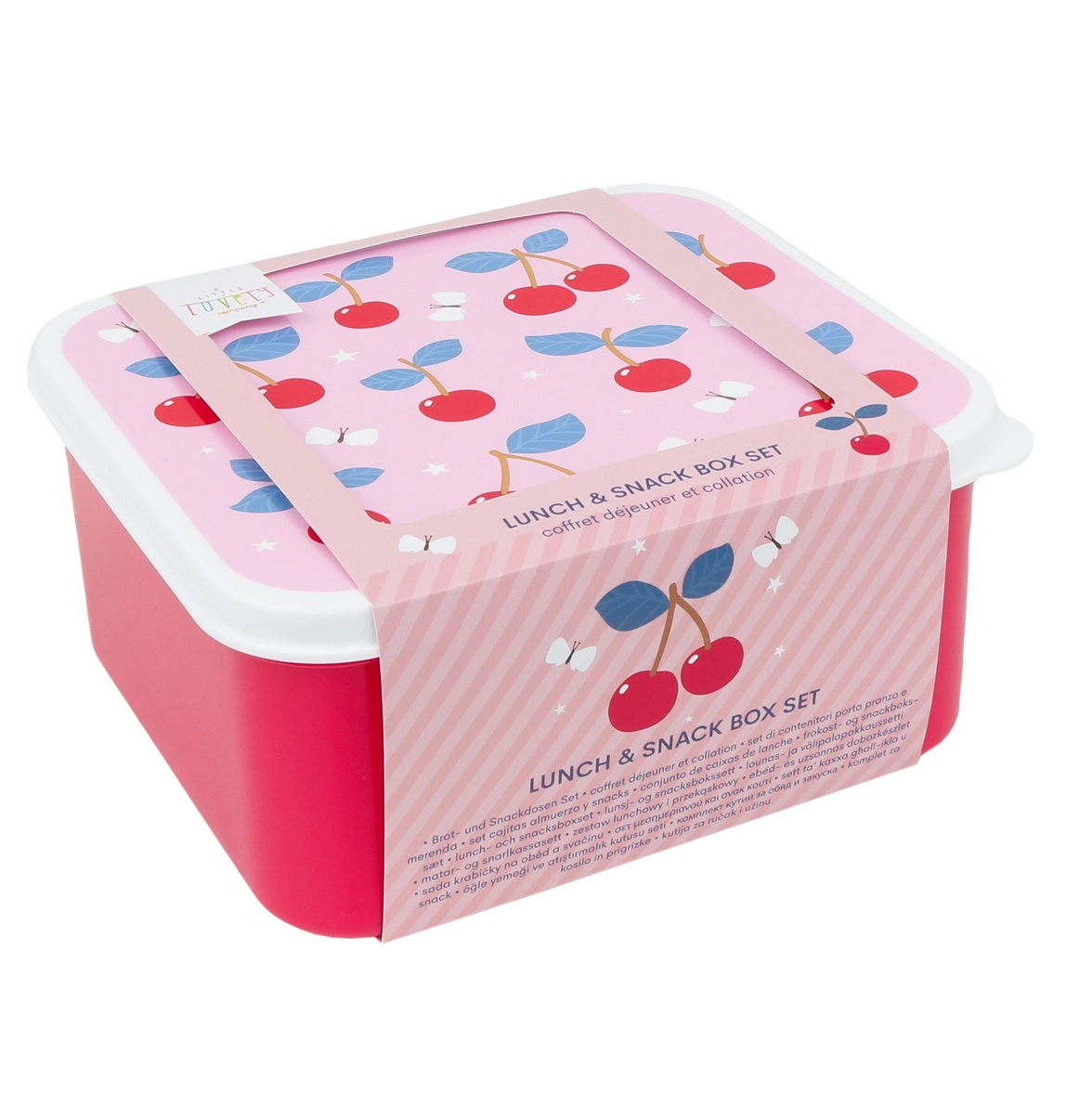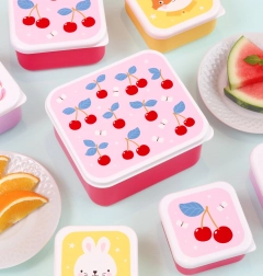 Tato sada svačinových krabiček je ideální pro každodenní použití díky svým čtyřem různým velikostem, které se mohou stohovat do sebe pro praktické skladování. Design třešní dodává vašim obědům a svačinám zábavný a přátelský vzhled. Upozorňujeme, že tyto krabičky nejsou vhodné do myčky ani do mikrovlnné trouby. Před prvním použitím umyjte všechny nádoby v teplé mýdlové vodě.