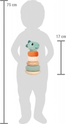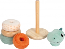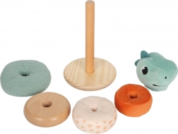Tato motorická hračka v podobě kolébající se věže s čtyřmi barevnými kroužky je ideální pro rozpoznávání velikostí a barev. Věž obsahuje bezpečnou pohyblivou středovou tyč a usměvavou hlavu dinosaura. Zaoblená základna zajišťuje stabilitu, zatímco různorodé látkové a dřevěné kroužky zaujmou svým designem.