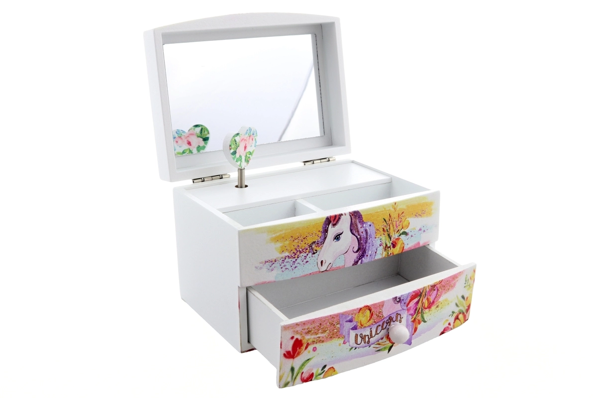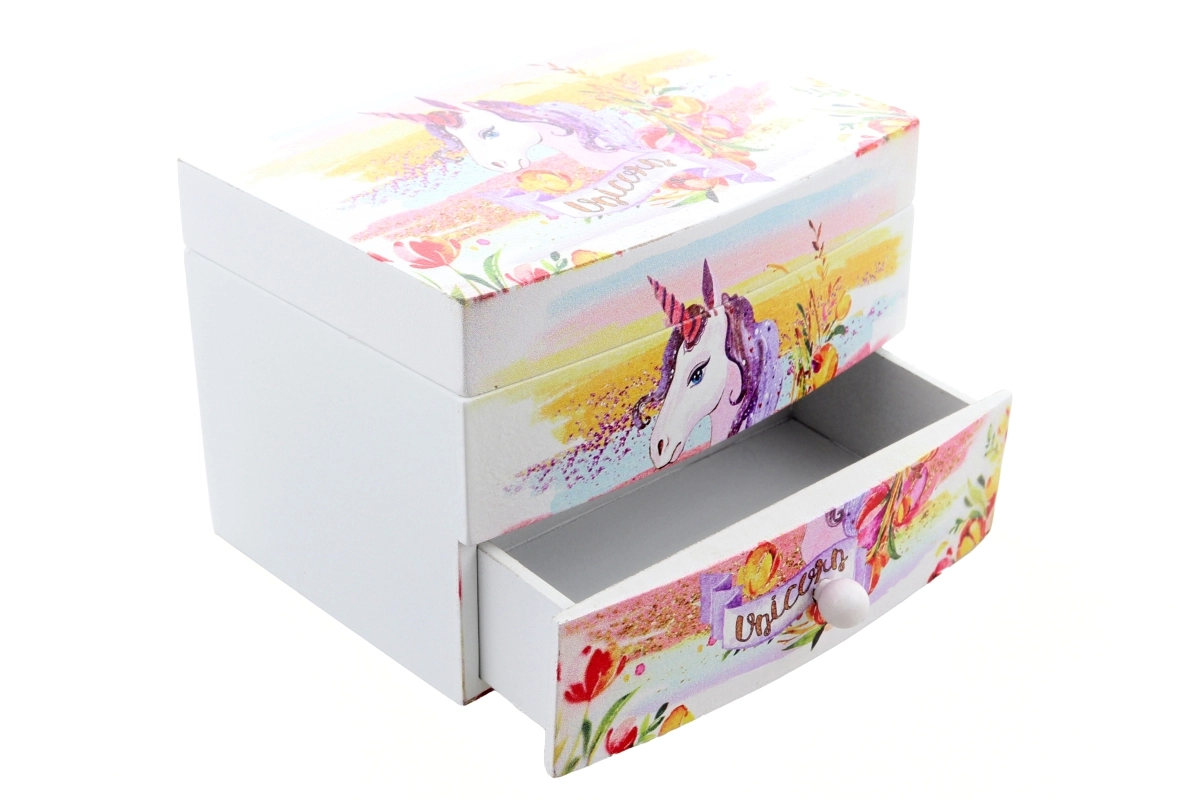 Dřevěná šperkovnice s motivem jednorožce, která je nejen designovým prvkem do dětského pokoje, ale i praktickým úložištěm pro malé poklady. Jedná se o dokonalý dárek pro děti, který svým kouzlem potěší.