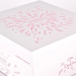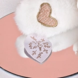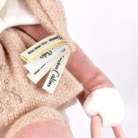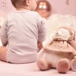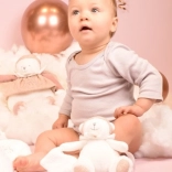 Plyšový lední medvídek má jemnou růžovou čepičku zdobenou saténovými stuhami s láskyplnými vzkazy ve francouzštině. Tělíčko je vyrobeno z hebkého materiálu s jemnou výšivkou značky Doudou. Medvídek nabízí různé podněty pro rozvoj smyslů a jemné motoriky: