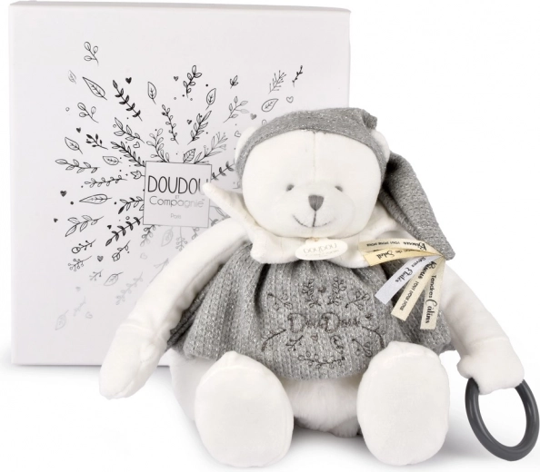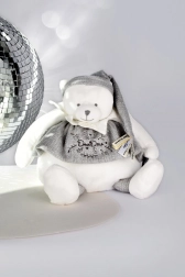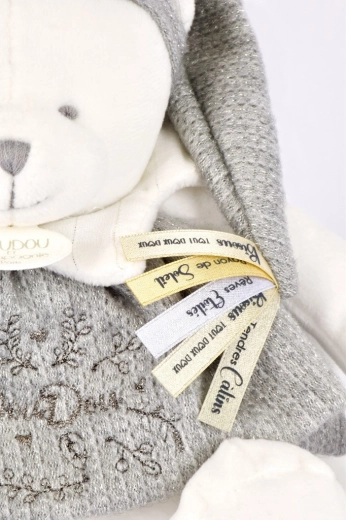 Doudou plyšový lední medvídek je ideální hračka pro novorozence. Díky šedé čepici ozdobené saténovými stuhami s láskyplnými vzkazy ve francouzštině nabízí medvídek něžný nádech každému mazlení.