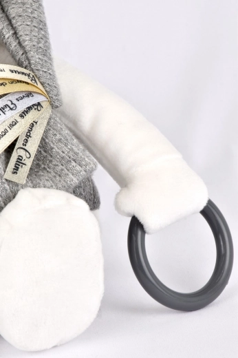 Tělo medvídka je vyrobeno z choťového materiálu příjemného na dotek a zdobí ho jemná výšivka značky Doudou. Pro rozvoj smyslů a jemné motoriky nabízí medvídek spoustu podnětů, jako jsou šustivý papír v tlapkách, plastový úchopový kroužek a chrastítko uvnitř těla medvídka.