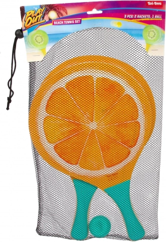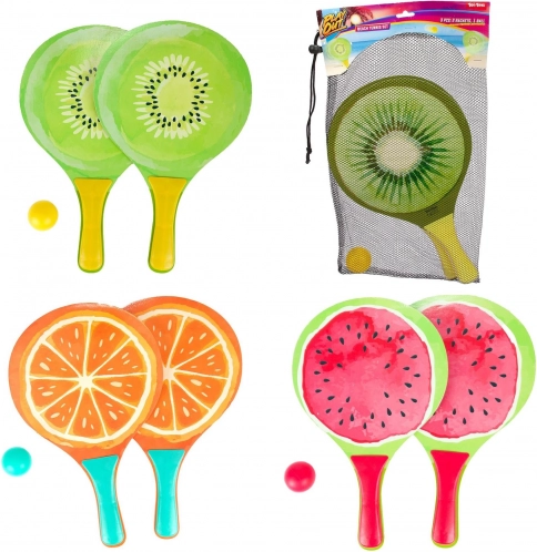 Užijte si léto naplno se stylovou sadou na plážový tenis s motivy ovoce. Obsahuje 2 lehké pálky a 1 míček v praktickém síťovaném sáčku na přenášení. Barevné potisky kiwi, melounu nebo pomeranče lákají ke hře na pláži, zahradě i v parku. Skvělé pro rodinnou zábavu, rozvoj koordinace a pohybu na čerstvém vzduchu.