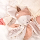 Tento plyšový medvídek je vyroben z hebké růžové tvídové tkaniny a zdoben jemnou výšivkou. Velké okvětní lístky na tělíčku pomáhají rozvíjet jemnou motoriku dítěte a zároveň poskytují pocit pohodlí a bezpečí.