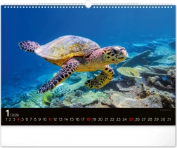 Úvodní stránka kalendáře vás zavede pod hladinu k nádherné mořské želvě proplouvající přes korálové útesy. Tato fotografie je důkazem dokonalosti oceánského světa.
