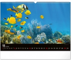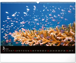 Březnový list kalendáře vás zahltí energií díky scenérii plné malých rybiček mezi korálovými útesy. Modrý oceánový pozadí dodává obrázku dynamiku a svěžest.