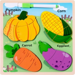 Tato dřevěná skládačka nabízí dětem skvělou příležitost naučit se tvarům a procvičit jemnou motoriku. Obsahuje čtyři oblíbené druhy zeleniny: dýně, kukuřice, mrkev a lilek. Každý prvek je rozdělen na menší části, které děti skládají v odpovídajících oblastech plochy.