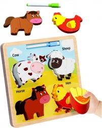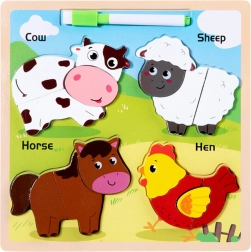 Tato dřevěná edukační skládačka obsahuje zvířátka jako kráva, ovce, kůň a slepice, která jsou známá dětem. Každé zvířátko se skládá z několika dílů, jež je nutno dopasovat na správné místo, což podporuje rozvoj koordinace pohybů a logické myšlení.