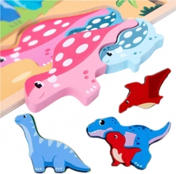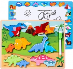 Tato dřevěná vzdělávací skládačka obsahuje 12 barevných dinosaurů, které dítě umisťuje na správná místa, což napomáhá rozvoji logického myšlení a soustředění. Kromě toho rozvíjí manuální zručnost a fantazii.