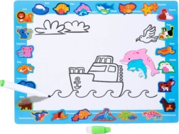 Na zadní straně desky se nachází sucho stíratelná tabule o rozměrech 30 x 22,5 cm, na které může dítě tvořit vlastní kresby přiloženým fixem. Je to vynikající způsob, jak rozvíjet představivost a cvičit jemnou motoriku.