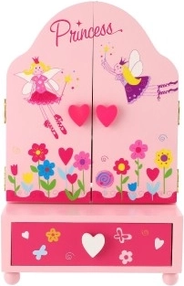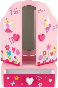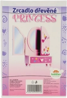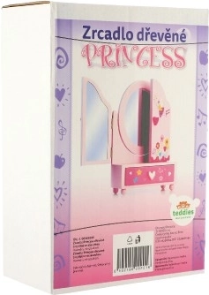 Dřevěná toaletka se šperkovnicí Princess je skvělým doplňkem do dětského pokoje. Středové oválné zrcadlo doplňují dvě postranní křídla pro pohodlné nastavení úhlu. Ve spodní části najdete praktickou zásuvku, kam si děti uloží své malé poklady. Jemné zdobení s motivy víl, květin a srdíček podporuje fantazii a radost ze hry.