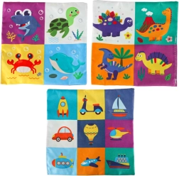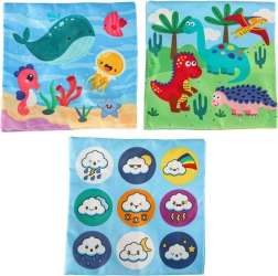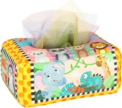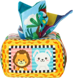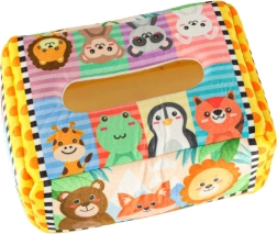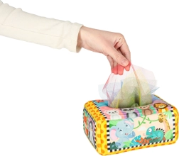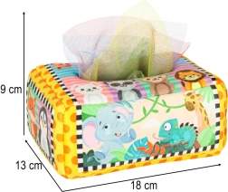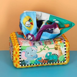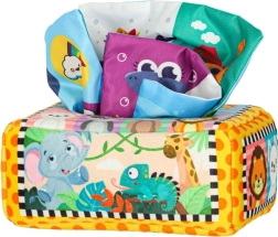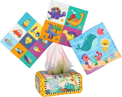 - Senzorická stimulace: Sada obsahuje 8 průhledných barevných kapesníků a 3 tkaniny s různými vzory, které stimulují zrak a hmat dítěte, rozvíjejí jeho senzorickou percepci. Plyšový box a tři vzorované kapesníky jsou vybaveny šustící fólií, která vydává jemný zvuk. Tento zvukový prvek podněcuje zvědavost a podporuje rozvoj sluchu.
