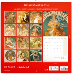 Přineste si domů kousek umění s tímto jedinečným poznámkovým kalendářem. Je ozdoben reprodukcemi nejznámějších obrazů Alfonse Muchy, který se proslavil především svými plakáty. Kalendář zahrnuje:
