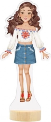 - Magnetická panenka, 30 magnetických částí (oblečení, boty, doplňky), dřevěný podstavec