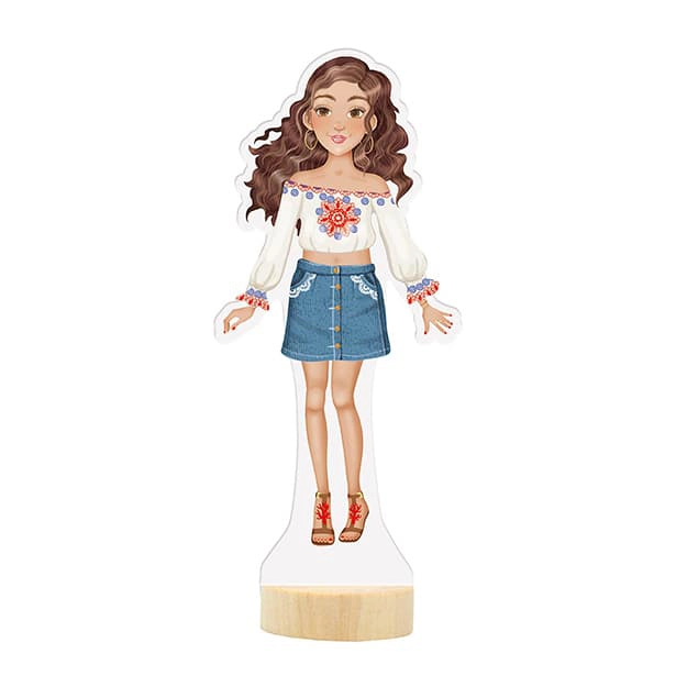 Objevte kreativní svět oblékání s touto magnetickou panenkou, která nabízí 30 magnetických částí pro kombinování oblečení, bot a doplňků. Díky dřevěnému podstavci je panenka stabilní a děti mohou snadno vytvářet nespočet módních kreací doma i na cestách.