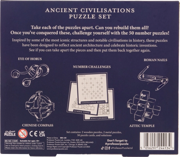 Nabízíme vám sadu hlavolamů, kterou nelze odmítnout – inspirace starověkými civilizacemi vás přiměje přemýšlet nejen o samotných hádankách, ale i o historii, která za nimi stojí. Tento set obsahuje: