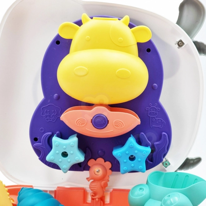 Po položení kufříku „na záda“ vytvoříte jednoduchý vodní stolek – naplňte spodní část, přelívejte pomocí kelímku a sledujte proudění vody. Sada je vhodná pro děti od 3 let a nabízí zábavu i pro dva.