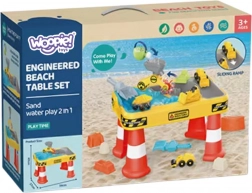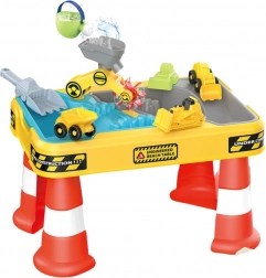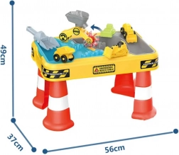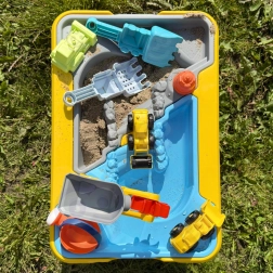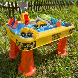 Velký stolní set s motivem stavby přináší dětem hodiny smyslové a kreativní hry. Dvojitá komora umožňuje samostatně naplnit část vodou a část pískem, takže si malí stavitelé mohou vyzkoušet bagrování, sypání, lití i řízení vozidel. Díky stabilním „kuželovým“ nohám je stůl pevný a bezpečný pro venkovní i vnitřní použití.