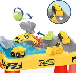 Součástí jsou 4 mini stavební autíčka (bagr, domíchávač, sklápěč, buldozer), otočný jeřáb, zjezd pro vozidla, vodní rampy a kolo i praktické doplňky pro písek a vodu (konev, lopatka, hrábě, formičky). Jednoduchá konstrukce zajistí rychlou montáž bez nářadí a snadné čištění po hře.