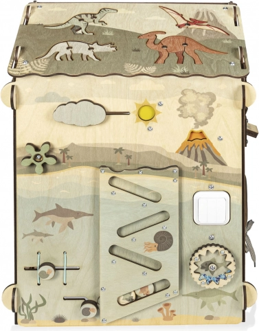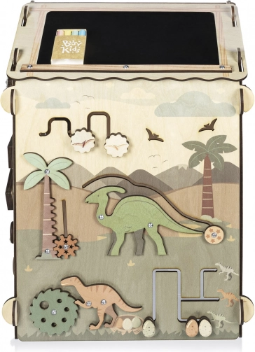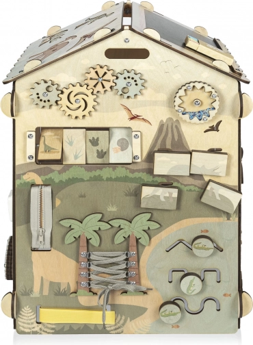 Střecha slouží jako černá tabule na křídy, 3D dinosauří puzzle podporují prostorovou představivost a otočné destičky se stopami vedou děti k pozornosti a logice. Praktické prvky jako zipy, tkaničky, ozubená kolečka a labyrinty pomáhají rozvíjet samostatnost.