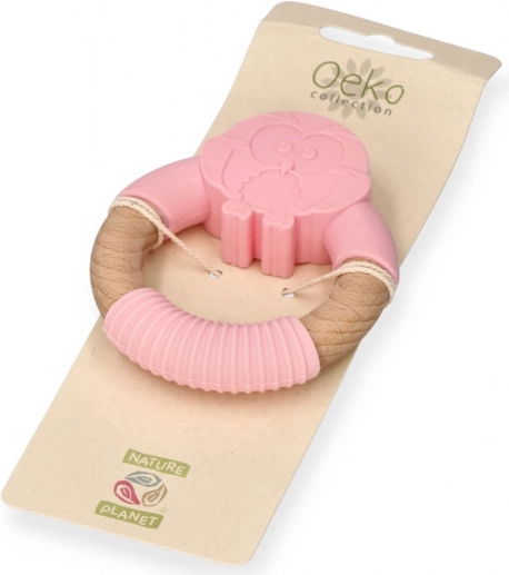 Růžové silikonové kousátko Nature Planet ve tvaru sovičky. Měkké, lehké, snadno omyvatelné, vhodné od 0m+. Rozměry 7 × 8,5 cm. CE shoda.