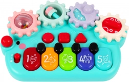 V horní části pianka jsou umístěna rotační ozubená kola, které dítě může otáčet, čímž si cvičí koordinaci ruka-oko a jemnou motoriku. Díky kompaktnímu rozměru je hračka ideální jak pro domácí hraní, tak na cesty. Vyrobena je z bezpečných materiálů a má příjemné pastelové barvy.