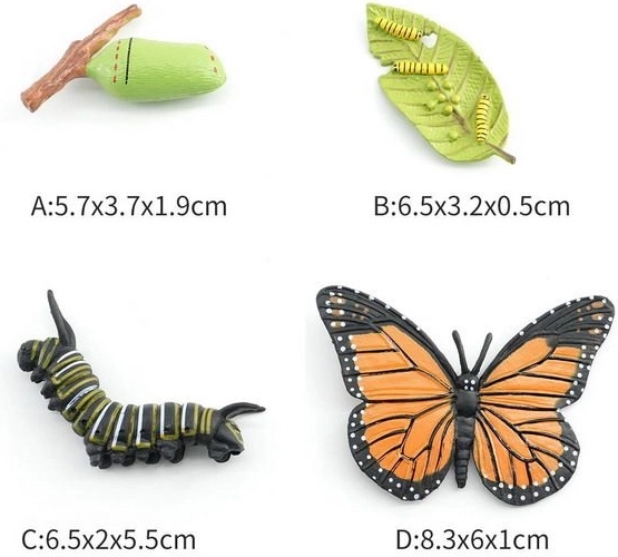 Zažijte fascinující proměnu motýla s touto detailně zpracovanou figurkou představující čtyři vývojové fáze: vajíčka, housenka, kokon a motýl. Ideální pro sběratele nebo k edukaci dětí.