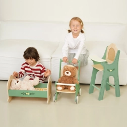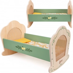 Tato okouzlující kolébka v odstínech zelené spojuje nadčasový šarm vintage stylu s přirozenou krásou ratanového úpletu. Klasické detaily a tlumená barevnost činí z kolébky perfektní přírůstek k jakékoli dětské hře, ať už jde o péči o panenky nebo plyšové medvídky. Jemné zdobení dává kolébce jedinečný charakter a měkká sada povlečení zaručuje panence pohodlný spánek.