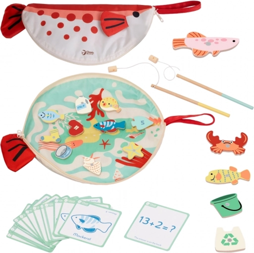 - 2 magnetické pruty, dřevěné rybky a předměty k lovení, edukační karty, podložka ve tvaru ryby / pouzdro