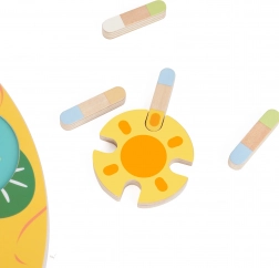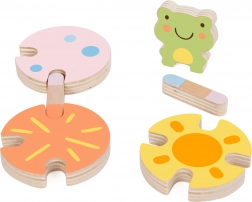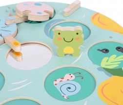 Barevná dřevěná žabka a jemné pastelové odstíny dávají hře estetickou hodnotu a podporují rozpoznávání barev.