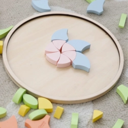 - Zahrnuje barevné kostky v pastelových odstínech, dřevěnou kulatou podložku a sáček