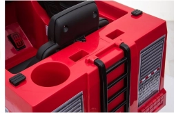 Uvnitř vozu je umístěna otočná volant s tlačítkem pro startování a přístrojová deska s napodobeninami měřičů. Technické parametry zahrnují akumulátor 12V7 Ah a dva motory o výkonu 2x45W, které umožňují jízdu rychlostí 2 až 4 km/h. Gumová kola EVA poskytují komfortní jízdu na různých površích.